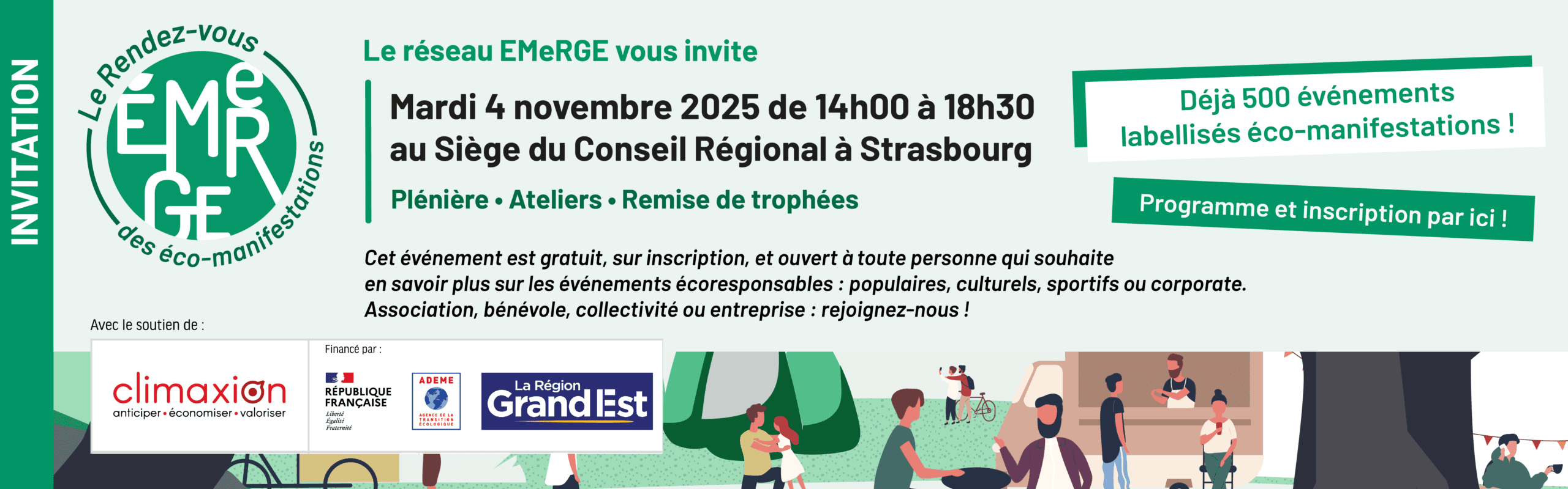 La création du projet EMeRGE est une initiative visionnaire dans l’Hexagone. Pour la première fois, des structures fédèrent leurs compétences en transition écologique pour promouvoir les comportements écoresponsables auprès des organisateurs de manifestations. Quel que soit le lieu de la région Grand Est où se produit l’événement, quelles que soient son ampleur et sa nature, du festival de musique au marché aux puces local, chaque organisateur peut désormais adopter une ligne de conduite écoresponsable cohérente avec ses priorités.